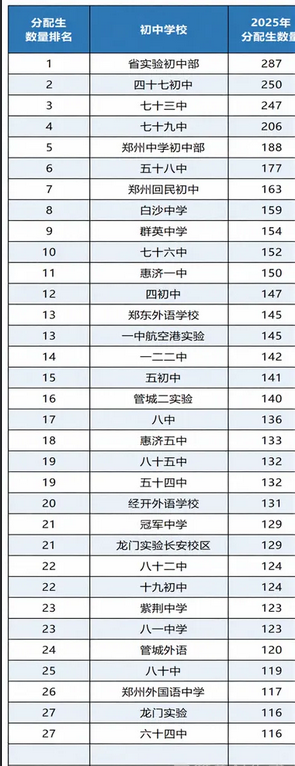 收藏!4所初中超200,52所初中超100,2025年郑州初中分配生数量排名