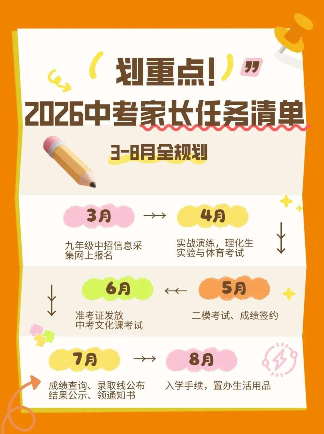 2026中考,已进入*关键的黄金冲刺阶段!许多家长想帮忙可能不知从何帮起,那今天这份家长任务清单,请收好。从3月信息采集报名,到6月决战考场,再到8月顺利升学......孩子负责冲分,你负责“不踩坑”~